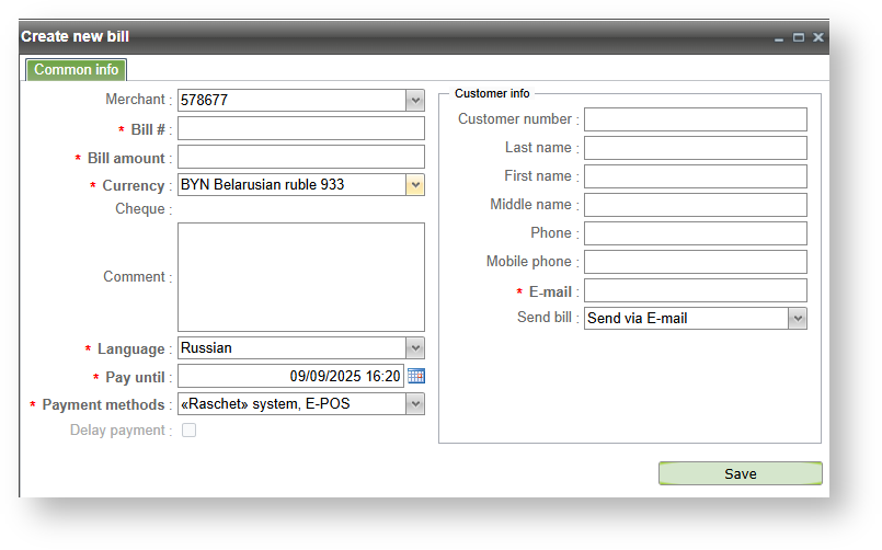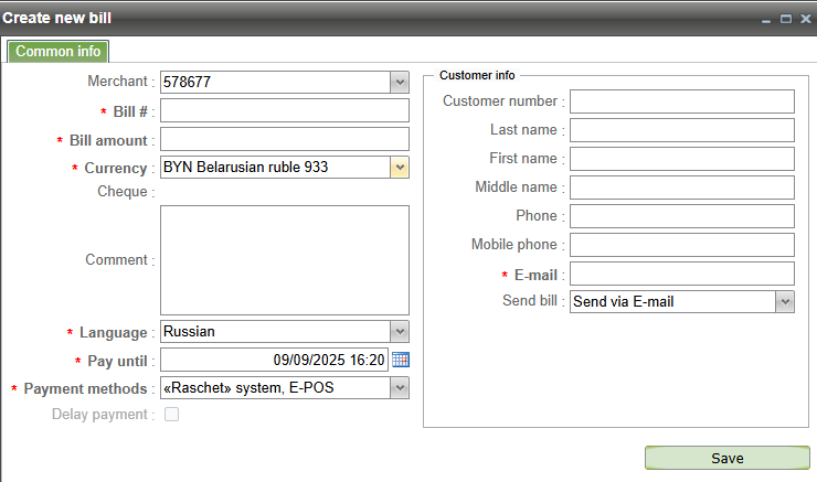 InfoLine* | No | 999 characters | Additional information – contract, commentary, etc. (the text from this field will be displayed to the customer upon payment). |