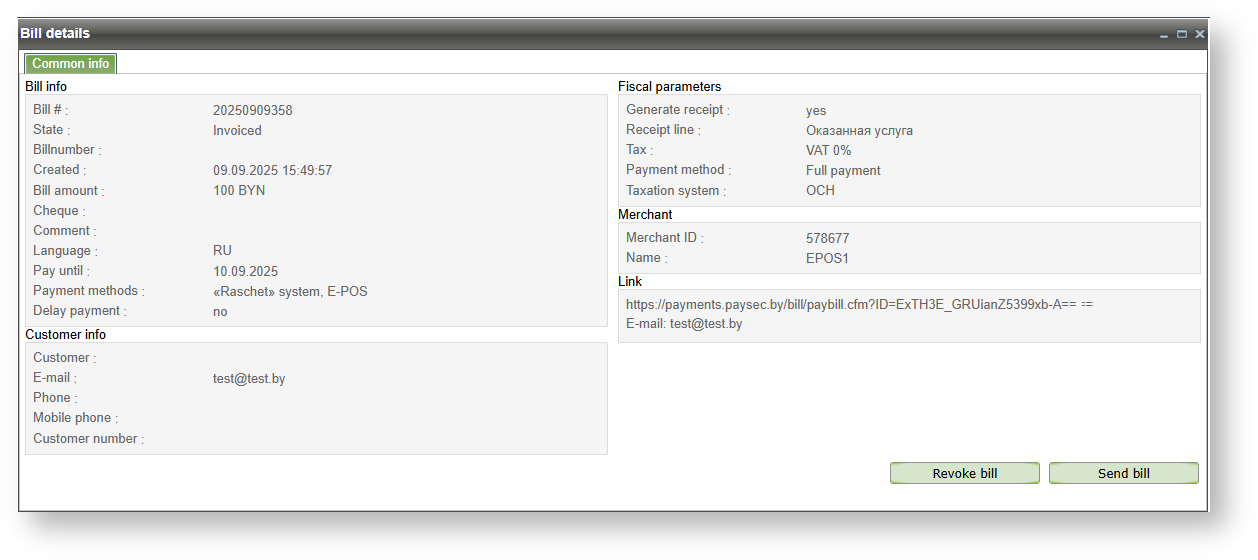 Bill _ currency | Yes | String | Bill currency (OrderCurrency BYN only) | |