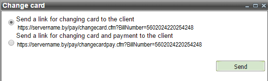 If the last subsequent payment is unsuccessful at the moment of selecting the context menu item "Change card" (the card is already expired, insufficient cash and so on), then You can select one of two links to send to customer: link to replace the card or link to replace card and pay the unsuccessful payment.