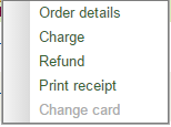 You can perform the following actions over order in the Order monitor window: payment confirmation (Charge), payment cancellation (Refund), print the bill (Print receipt).