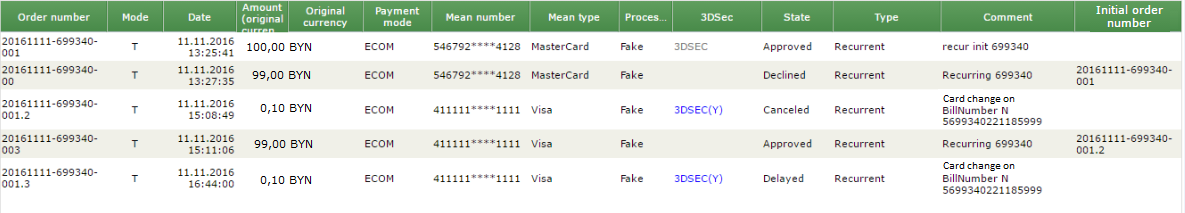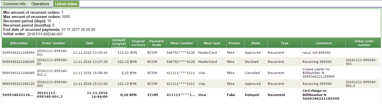 The information about blocked amount is displayed also in the tab ’Related orders’ of order details dialog for any payment of this subscribe. The "Comment" field shows the cause of the blocking payment.