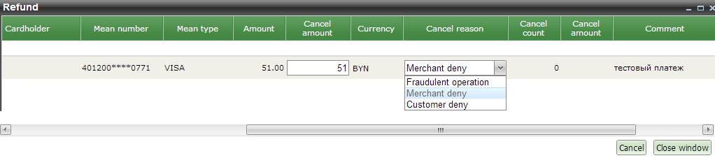 Column  'Cancel amount'  contains (by default) the full authorization amount. It can be changed (decreased) in case when a partial cancellation is required (for example the customer decided to return a part of the ordered items). The ' Reason ' field should be set according to reason of cancellation. By default it is set to  'Customer deny'  value.