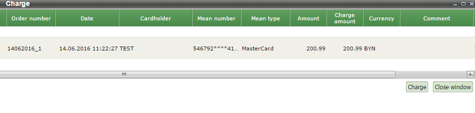 When you select  'Charge ' option in the order's context menu the ' Charge ' window will appear as it shown on the picture below.