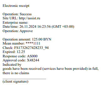 It is possible to change the view of the printed receipt on request by the enterprise. Please, contact support team (support@belassist.by) in such case.