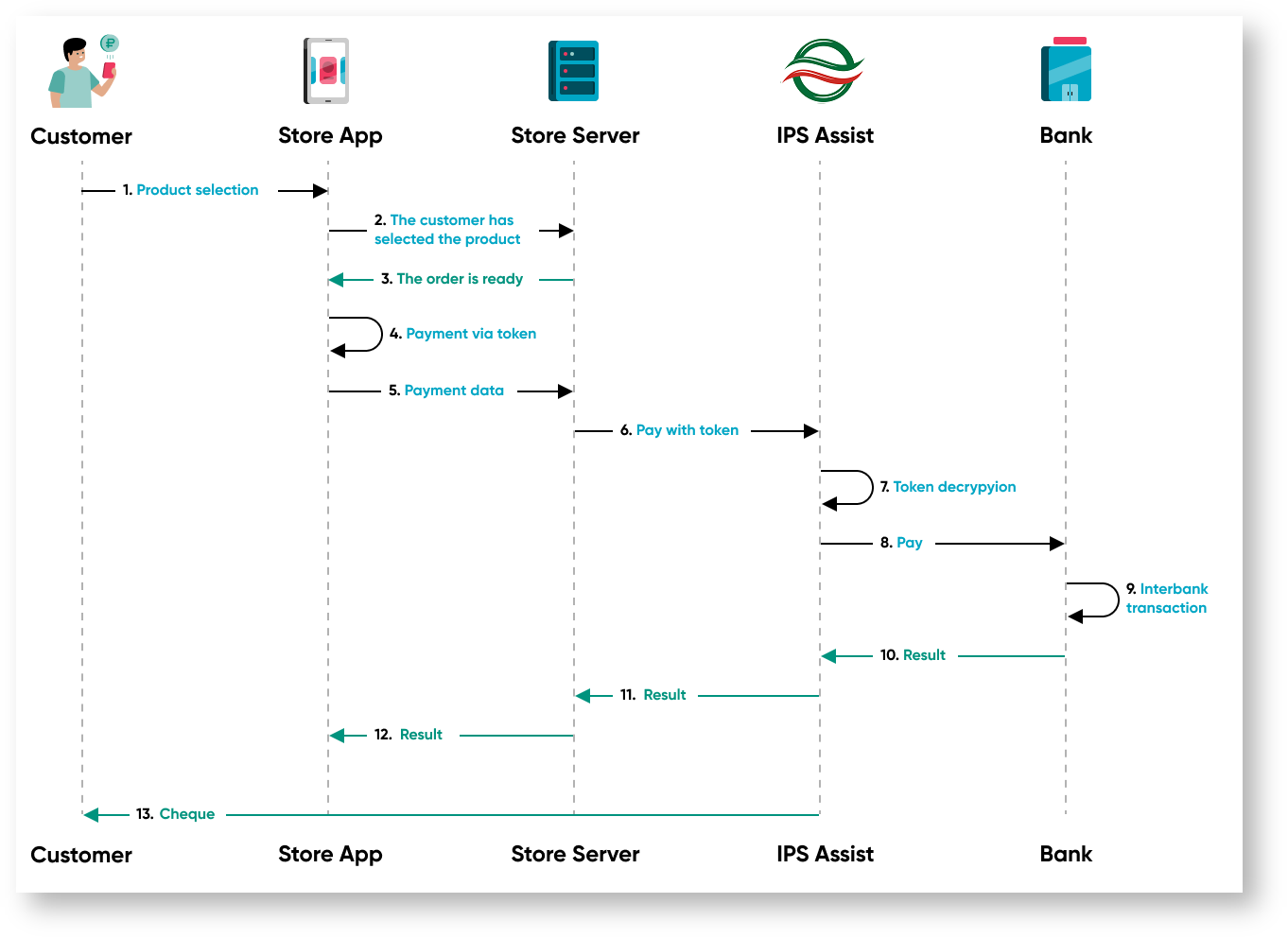 - The encrypted packet with payment data and a token is transferred to the TokenPay payment service on the side of IPS Assist.