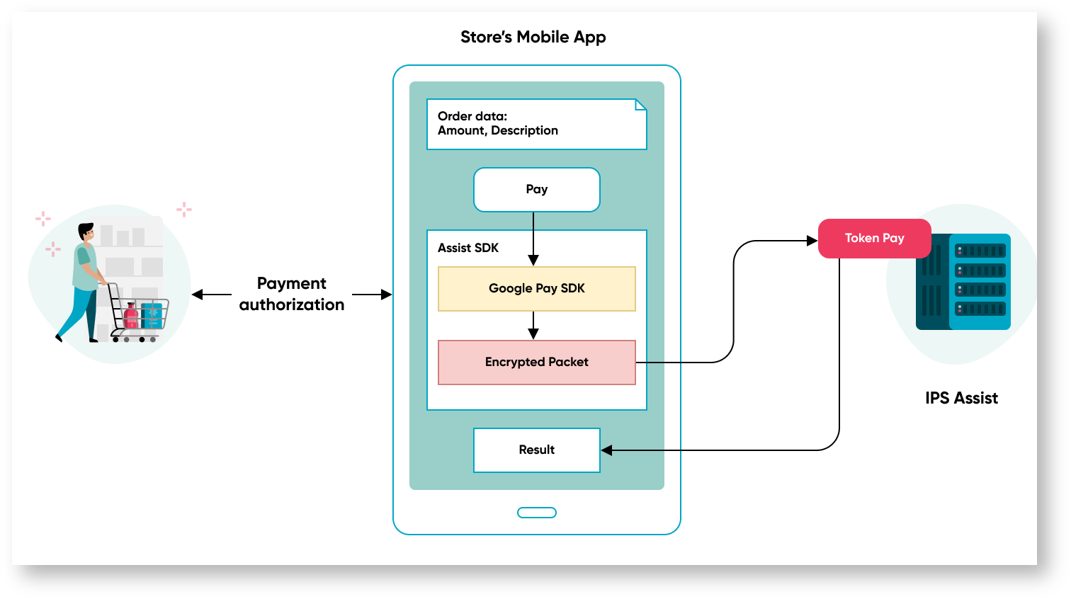 You have to use the Google Pay API for Android,if you don't want to use SDK Assist in the online store mobile app, for creatation of the encrypted package with payment information. The created encrypted packet with payment details then must be transferred to the IPS Assist through the TokenPay service.