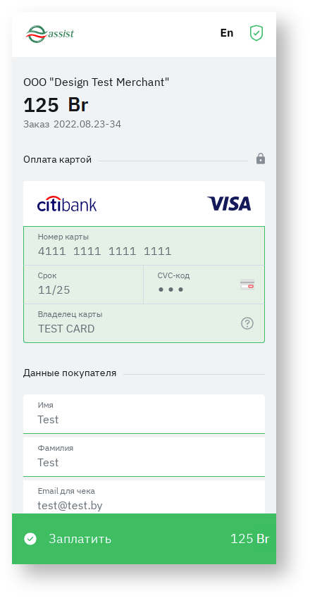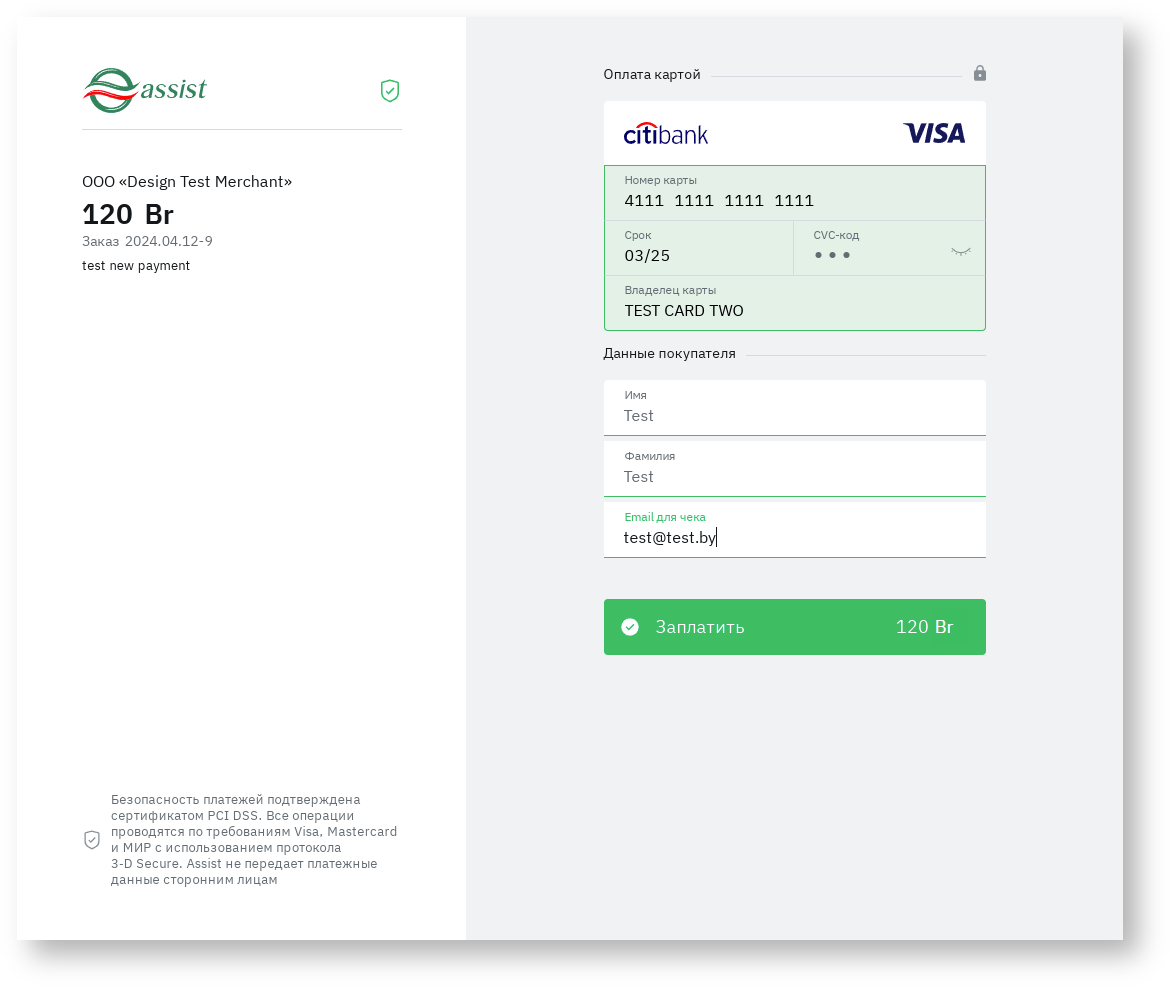 Это минимальный набор параметров платежа, который передается со стороны предприятия при перенаправлении покупателя на сервер АПК Ассист, после чего покупатель вводит на авторизационных страницах АПК Ассист персональные данные (ФИО, адрес, Email, телефон и т. п.) и данные о платежном средстве.