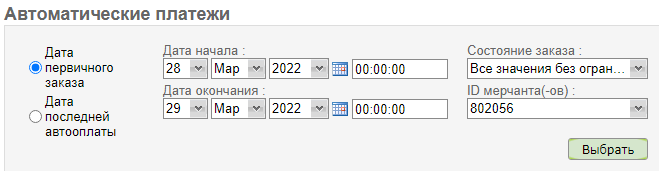 - Дата первичного заказа – Дата последней автооплаты – пара элементов управления, каждый из которых позволяет ввести число, месяц, год, час, минуту.
