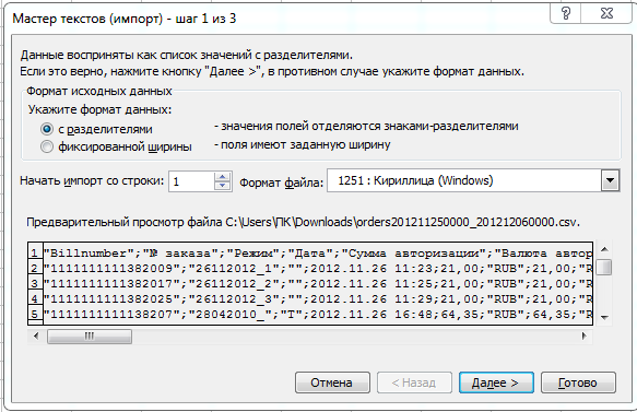 • на шаге 1 указать формат данных с разделителями и подходящую кодировку кириллицы (формат файла); рекомендуемая кодировка - юникод (UTF-8), однако, если после выбора кодировки текст в первой строке окна предварительного просмотра файла будет отображаться неправильно, следует подобрать другую подходящую кодировку (на примере ниже это 1251 Кириллица (Windows));