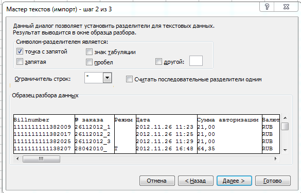 • на шаге 2 указать в качестве символа-разделителя точку с запятой;